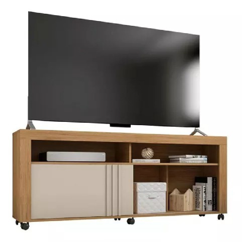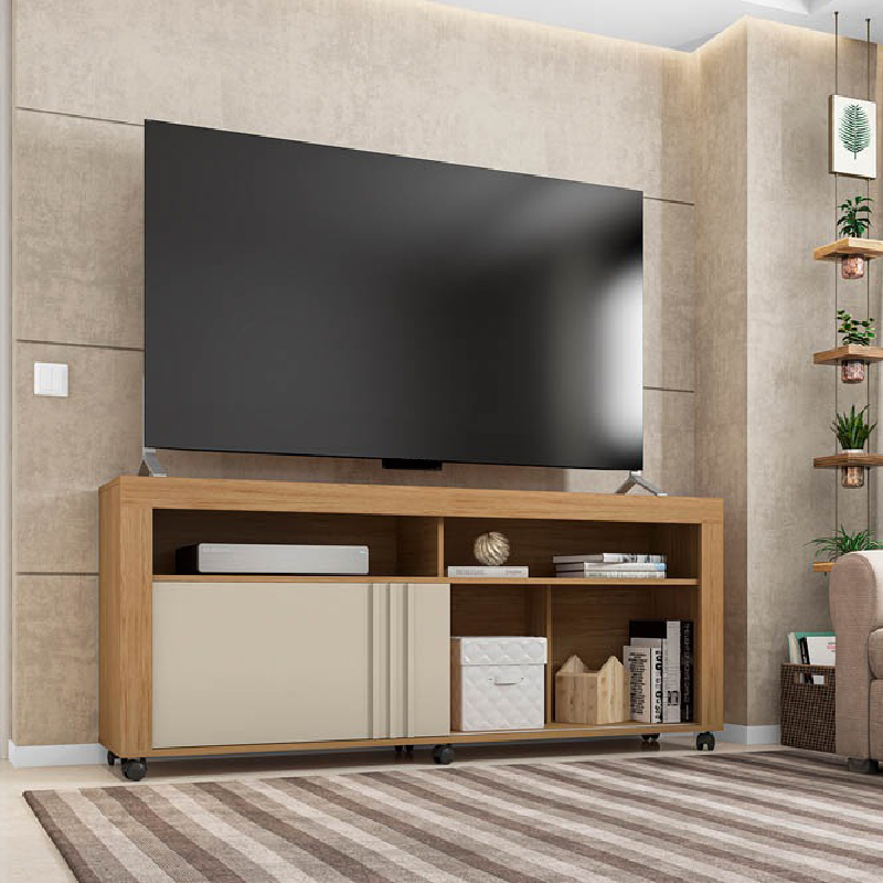 • Tiene vistas frontales que enmarcan el producto con dos nichos ideales para dispositivos electrónicos y una puerta corrediza con detalle de lamas de MDF.